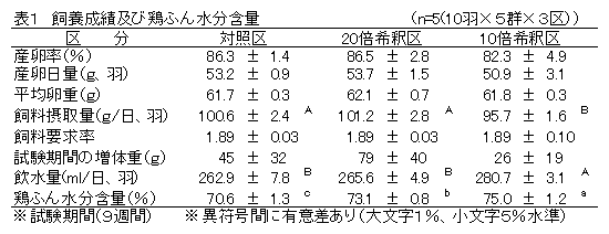 海洋深層水は、様々な分野で「新資源」として注目を浴びており、その清浄性やミネラルが豊富に含まれている特性を活用した商品が続々と市場に登場している。平成14年度から、三重県でも企業等による海洋深層水の産業利用を促進するため、尾鷲市沿岸で暫定取水を開始し、平成18年度からの本格取水へ向け、産業利用の一層の拡大が望まれており、水産分野以外での新たな利用方法について研究開発が期待されている。そこで、本試験では、原水希釈水をニップル式給水器を用いて産卵鶏に給与し、産卵成績及び卵質等に及ぼす影響を調査する。 |