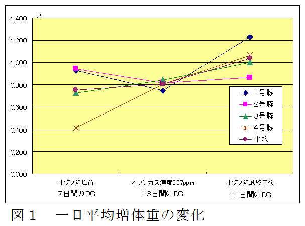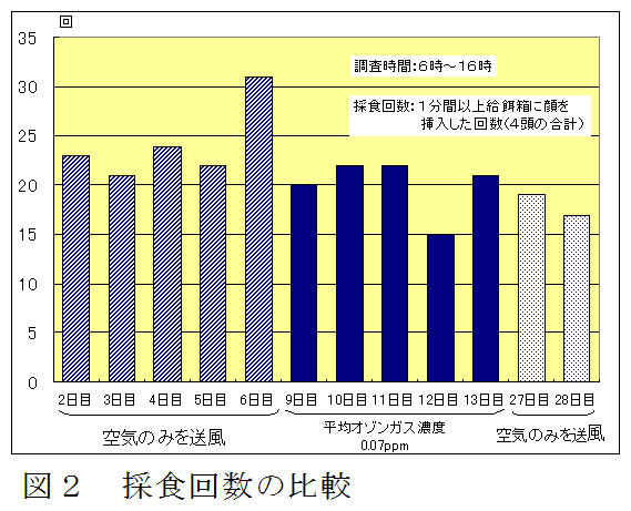 0.1ppm以下のオゾンガス濃度の中で豚を飼養しても発育性、採食回数、飼料摂取量、血清中ビタミンC濃度、過酸化脂質量、赤血球浸透抵抗性などに異常が認められない。 |