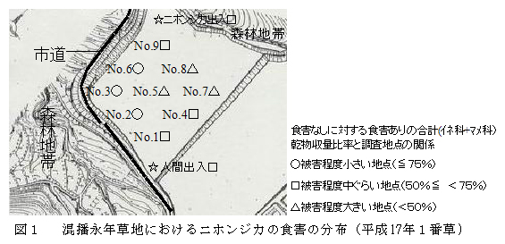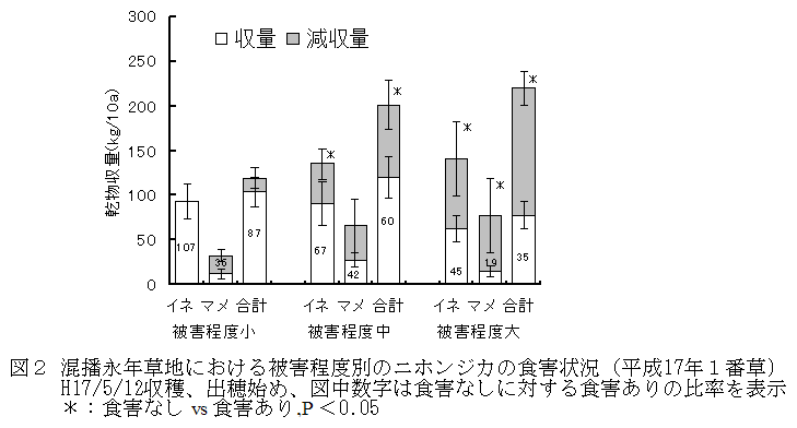 混播永年草地のニホンジカの食害の大きい1番草において、特にマメ科牧草(シロクローバー、アルファルファ)の被害が大きく、さらに被害程度が大きくなるほどマメ科牧草の減収率が高くなる。 |