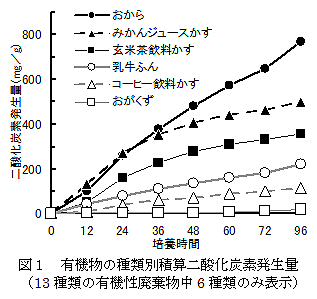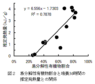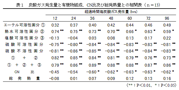牛ふんなどの有機物の堆肥化における分解速度は、分解時の二酸化炭素発生量から推定が可能で、分解速度は易分解性有機物含量と高い相関関係にある。一方、従来から堆肥化の指標として用いられるCN比は分解速度との相関が低い。 |