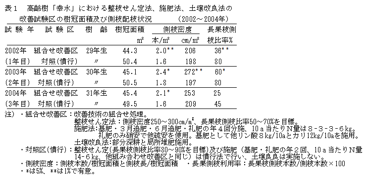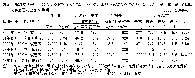 整枝せん定、施肥、土壌改良によるニホンナシ「幸水」の樹勢回復と増収効果 |