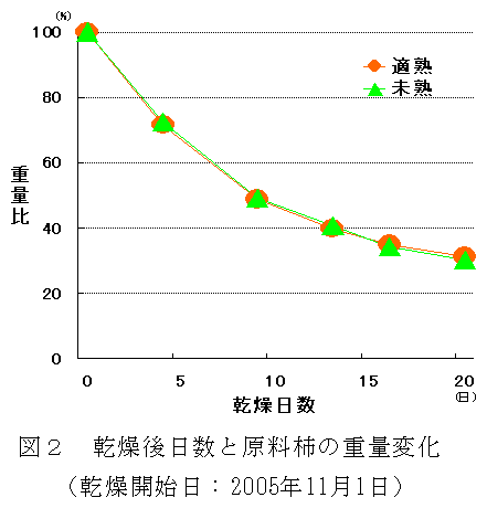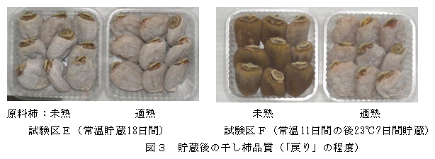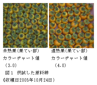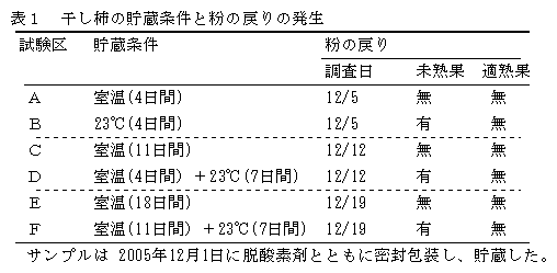 未熟な原料果実から加工した干し柿「市田柿」は、貯蔵中に粉の戻りが発生しやすく、商品価値が低下するので、干し柿「市田柿」の加工には適熟果を使用する。 |