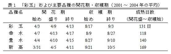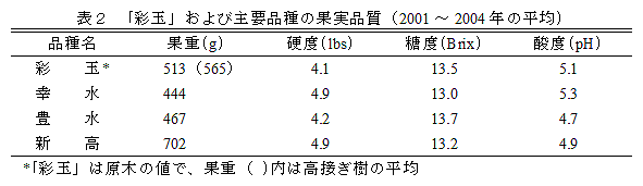 「彩玉」は「新高」に「豊水」を交配して育成した中生の赤ナシで、「幸水」と「豊水」の間に収穫される。高接ぎ樹の平均果重は550g程度で、この時期のニホンナシとしては大果である。果肉は軟らかく、糖度が高く、酸味は少ない。 |