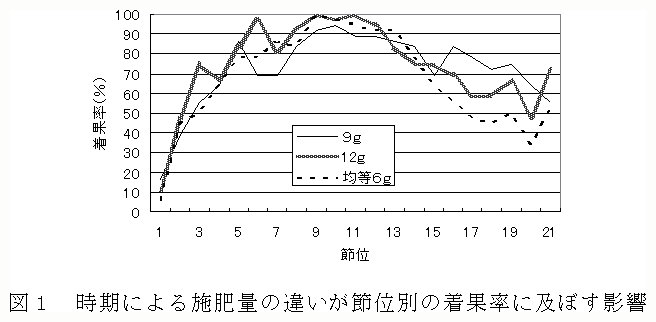 12月に加温を開始するイチジクのボックス栽培で液肥を施用する場合、着果開始期から摘心期までの施肥割合を増加させることで、結果枝上位節での着果率が向上し、収量が増加する。 |
