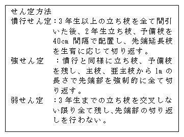 ウメ「紅サシ」において、せん定の強弱が長梢の最大葉の葉面積に反映される。最大葉の葉面積が30cm2以上を強せん定樹、25cm2以下を弱せん定樹と診断する。 |