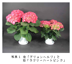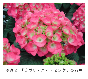 アジサイ新品種「ラブリーハートピンク」は、鮮やかな濃いピンク系の品種で、現在鉢物として栽培されているセイヨウアジサイの品種に比べ、わい性のため5号鉢以下の小鉢生産に向く。 |
