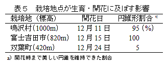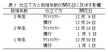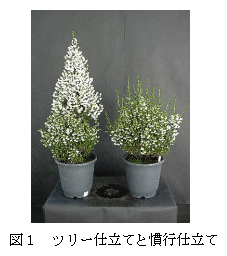 1年生の良苗および2年生以上の株を円錐形に仕立てることにより開花が約2週間促進する。花芽を肉眼で確認後、最低温度を18℃に管理することで11月下旬から出荷できる。花着きは夏期標高800m以上の露地で栽培することにより向上し、花が雪を連想させる小さなクリスマスツリーに仕立てることができる。 |