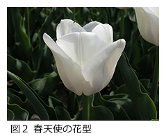 チューリップ品種の中で、早期促成栽培が可能な白系品種は少ない。また、小型の品種は、風雨に強いことから花壇植えに適するが、茎長が短く切り花生産には適さない。 |