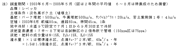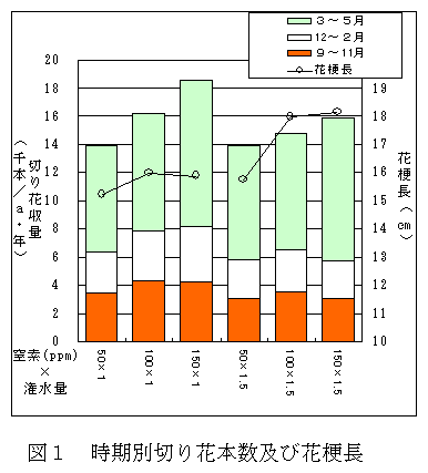 潅水同時施肥栽培は多くの品目で潅水や施肥作業の省力化及び収量増に有効であることが明らかにされている。アルストロメリア潅水同時施肥栽培の普及を図るため、適正潅水量及び施用窒素濃度を把握する。 |