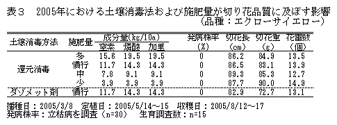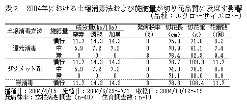 トルコギキョウにおいて土壌還元消毒の効果は、ダゾメット剤と同等である。施肥量の違いによる切り花品質の差は認められず、少ない施肥量での栽培が可能である。 |