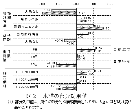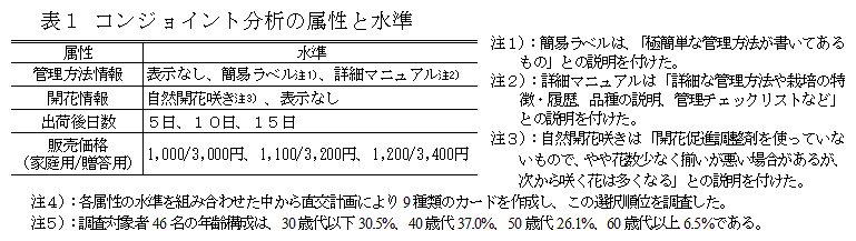 シクラメンには簡単な管理方法を記載したラベルを付けた製品は多くある。また、より詳細な管理マニュアルが添付されたものや、「自然開花咲き」などの製品特性情報を示す製品もある。しかし、これらの情報が消費者価値の向上にどの程度貢献しているかは明らかでない。そこで、販売時に添付することによって製品価値の向上に有効な情報を、マーケティング分野で用いられるコンジョイント分析により明らかにする。 |