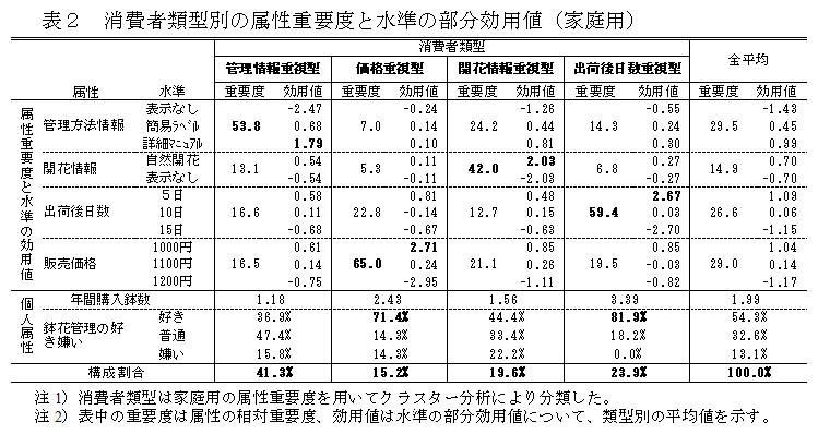 シクラメンの商品価値を向上させるのに有効な情報は購入者の属性により異なる。年間購入数が少ない消費者には、家庭での管理方法等を記載した詳細なマニュアルの添付で、特に贈答用の高級品で効果が大きい。また、年間購入数が多く鉢花管理に関心の高い消費者には、出荷後の期間が短いことを示す情報の提供が有効である。 |