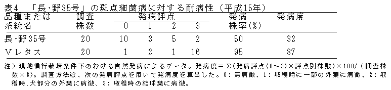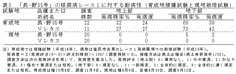 「長・野35号」は、根腐病と斑点細菌病に対する耐病性に優れ、商品性に優れた初夏どり向きの新品種である。 |
