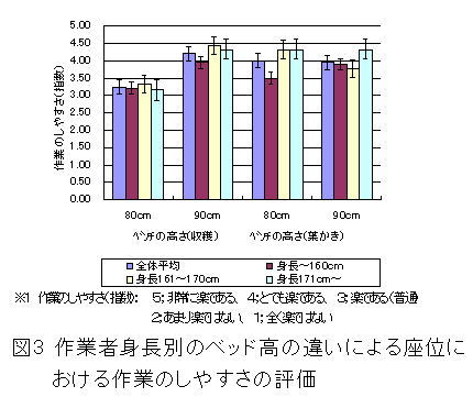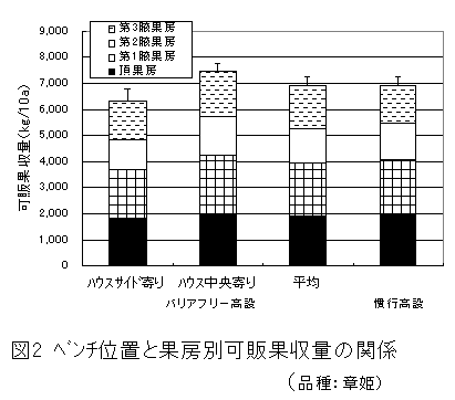 バリアフリーイチゴ高設栽培技術は、専用移動用椅子に作業者が座ったまま栽培が可能な栽培法で、ハウス側面のベンチをハウス側面近くに設置すれば、通路幅を1mとしても慣行高設栽培と同じ栽培株数が確保でき、慣行と同等の収量が得られる。 |