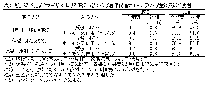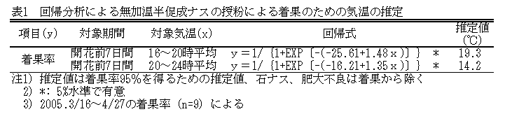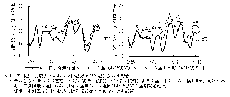 トンネル被覆による無加温半促成ナス栽培の着果方法は、低温期は着果不良を補うため、ホルモン剤の単花処理を行い、4月中旬以降に訪花昆虫による授粉に切り替えられている。現地では、省力のために1日でも早期の訪花昆虫の導入が望まれている。そこで、安定着果を図るとともに、訪花昆虫の導入時期を前進させ、ホルモン剤の処理作業の早期・省力化を図るため、着果に必要な温度条件を把握し、適切な保温条件を明らかにする。 |