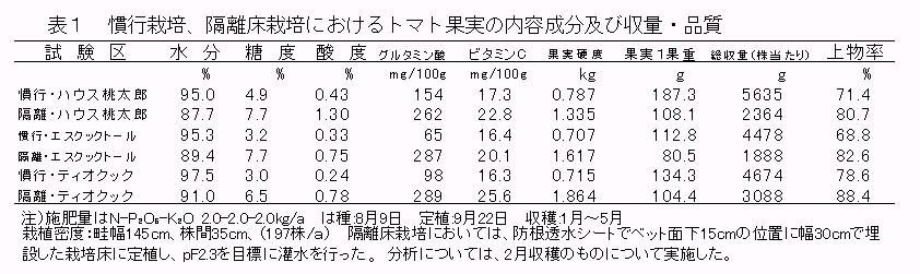 「ボンジョールノ」、「エスクックトール」はリコピン含有量が多く収量性(肥大性)の優れる調理用品種である。また、機能性成分であるリコピンやグルタミン酸、ビタミンC等の栄養成分は隔離床栽培により増加するが、収量は減少する。 |