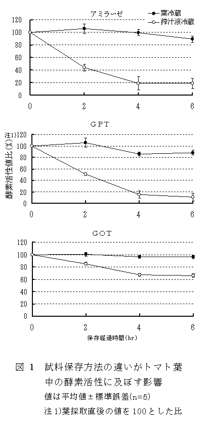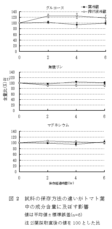 トマト葉の生化学成分の簡易分析において、葉を採取後速やかに分析できない場合、アミラーゼ活性、GPT活性、GOT活性、グルコース含量については、葉をポリ袋に入れて冷蔵保存し、分析の直前に搾汁すると測定値が安定する。 |