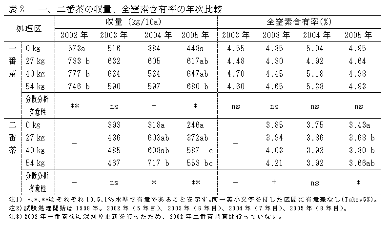茶園での施肥量は他の作物に比べ多く、溶脱した肥料成分が環境に及ぼす影響が指摘されている。一方で、年間窒素施用量を継続して削減した場合の茶生産への影響が懸念されているため、1998年より窒素施用量10アールあたり54kgに対して、40kg、27kg、0kgの処理区を設けたほ場で、茶樹の生育、収量に対する影響を明らかにする。 |