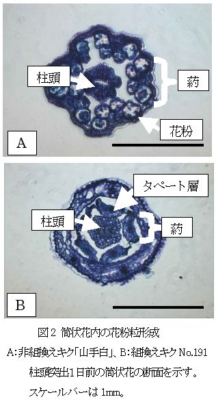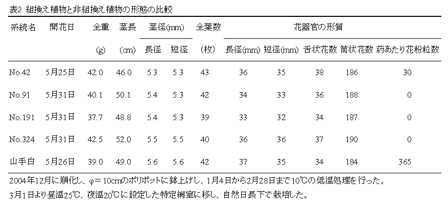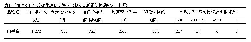 69番目のヒスチジンをアラニンに置換したメロン由来改変エチレン受容体遺伝子を遺伝子組換え技術によってキクに導入することで、花粉が全く形成されない雄性不稔キクの作出が可能になる。 |