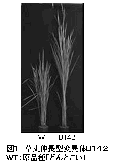 イネの草丈が約2倍に伸長する変異体の原因遺伝子はGA(ジベレリン)生合成に関与するOsGA20ox1 であり、この変異体では内在性GA量が増加している。OsGA20ox1 の発現量を増減させた組換え体において草丈は顕著に影響を受ける。 |