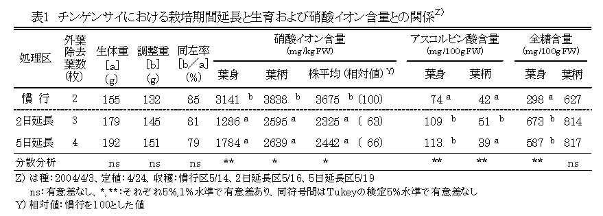 [キーワード]チンゲンサイ、硝酸イオン含量、栽培期間延長、収穫調製 |