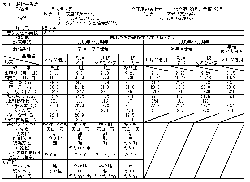 水稲「とちぎ酒14」は、晩生の早に属する粳種である。千粒重は「若水」と同程度に重く大粒で、「若水」より2割程度収量性が高い。心白の発現は小さく少ない。玄米タンパク質含有量が低く、淡麗ですっきりした純米酒向けの酒造好適米品種として、栃木県で奨励(認定)品種に採用された。 |