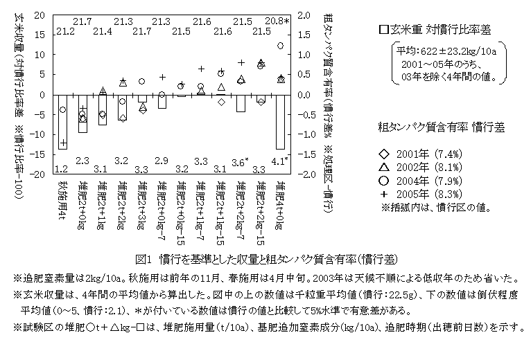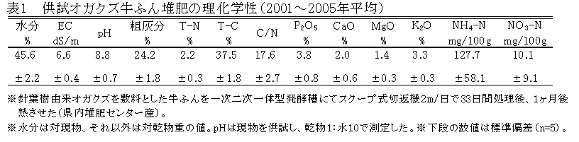 コシヒカリ早植栽培において、オガクズ牛ふん堆肥10aあたり2tを春施用し、出穂期前15日に窒素成分2kgを追肥することで、5年間は慣行栽培並の収量と玄米タンパク質含有率が得られる。 |
