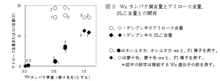 米のアミロペクチンに含まれる長い側鎖(スーパーロングチェーン)の合成は主にWx 遺伝子により制御され、Wxタンパク質含量が高いほどスーパーロングチェーンの合成量が多くなる。 |