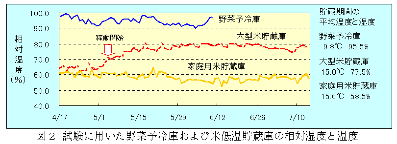 大豆の発芽時の湿害回避には、種子水分を15%程度に調節して播種する手法の有効性が知られており、数種類の水分調節方法が提案されている。しかし、1日で数ヘクタールを播種し、100kg以上の種子を使用する大規模経営に導入できる多量な種子の水分調節技術は未確立である。そこで、既存の野菜予冷庫や大型米低温貯蔵庫を利用した大豆種子水分調節の可能性を検討する。 |