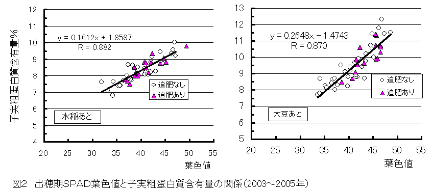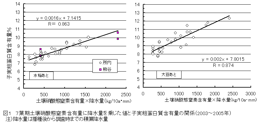 小麦「農林61号」の子実粗蛋白質含有量は7葉期の土壌硝酸態窒素含有量の簡易測定値と播種から7葉期までの降水量の積により、または穂揃い期の止め葉の葉色値により予測可能であり、それぞれの時期において追肥の要否が判定できる。 |