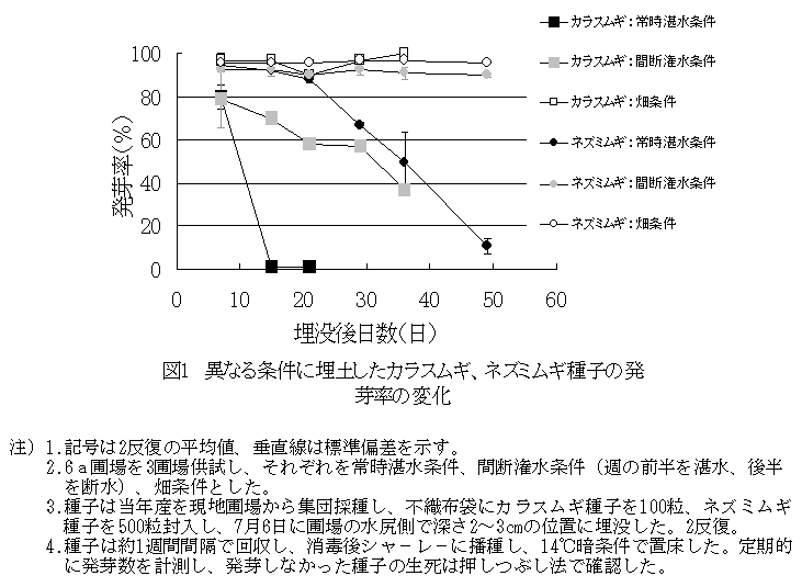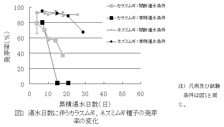 麦作難防除雑草のカラスムギ種子は、夏期の常時湛水条件で15日以内に死滅するが、間断潅水条件では死滅率は低下する。ネズミムギ種子は50日間程度の常時湛水条件で約90%死滅するが、間断潅水条件では50日でも死滅効果が得られない。 |