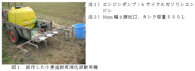 生ごみ原料メタン発酵処理残さ液(消化液)は、特別栽培の小麦への追肥効果が鶏ふんより高く、収量の向上、粗タンパク質が向上する。消化液の小麦追肥散布機を試作し作業可能面積を試算した。 |