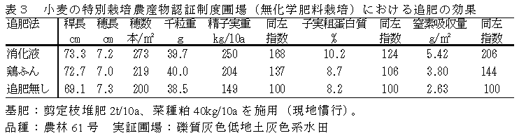 埼玉県小川町では、NPOと行政が協力した生ごみのメタン発酵処理が行われ、その残さ液(消化液)の農業利用が望まれている。一方、同町の麦作集団は特別栽培農産物認証の無化学肥料小麦栽培を取り組んでいるが、追肥用の有効な有機質資材が無く、低収、粗タンパク質含量の低下が問題となっている。 |