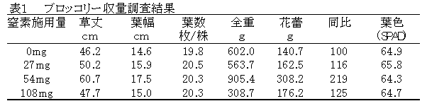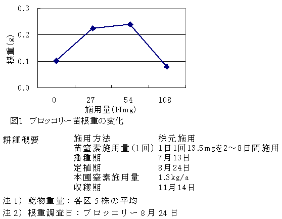 生ごみメタン発酵消化液は、アンモニア態窒素が主体の即効性の液肥としてブロッコリー苗に利用できる。1セル当たりの窒素適量は約50mgであり、根重増加、定植後の初期生育が確保される。 |
