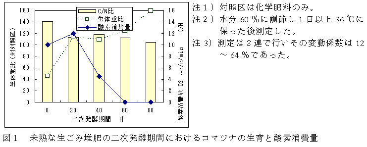 生ごみ堆肥の熟成が進み植物の生育が向上するに従って堆肥の酸素消費量値が低下する傾向がある(平成16年度成果情報{埼玉農総研})。しかし、生ごみ堆肥は水分変動が激しいことや酸素消費量値にバラツキが大きいことが問題であり、再現性のある測定条件の確立が必要である。 |