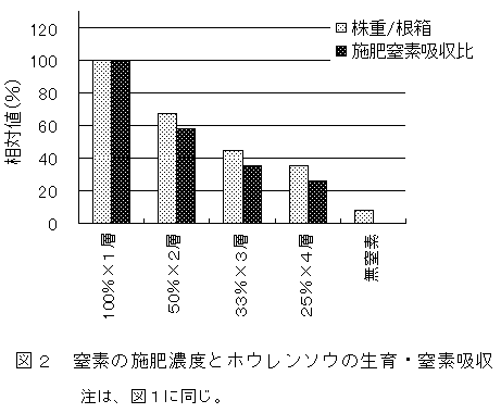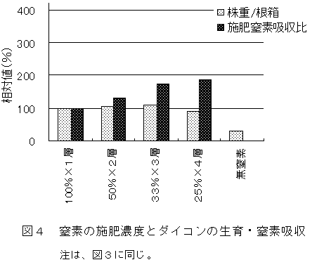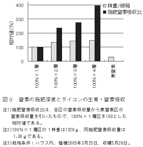 ホウレンソウの生育と窒素吸収は、0~15cmの土壌中窒素濃度に依存する。 ダイコンは、0~60cmの施肥窒素を吸収でき、窒素吸収量は土壌への投入量に応じて増加する。 |
