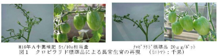 ホルモン型の除草剤であるクロピラリドが牛ふん堆肥中に残留している場合、トマト栽培における生育障害の原因となることがある。トマト以外でもナス科、マメ科、キク科、セリ科に属する作物はクロピラリドに対して感受性が高いものが多い。 |
