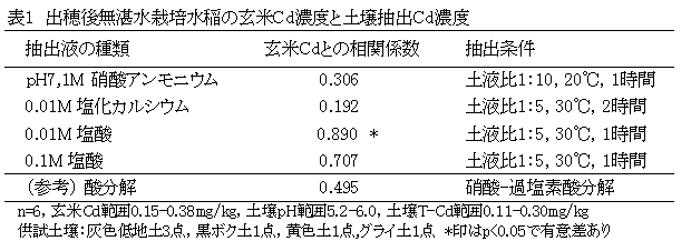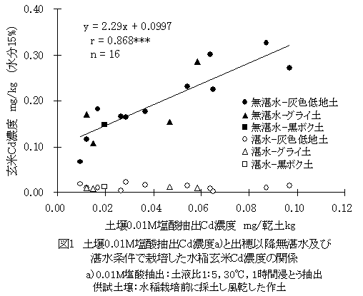 土壌0.01M塩酸抽出カドミウム濃度は、出穂以降無湛水かつ乾燥条件(カドミウム高吸収条件下)で栽培した水稲の玄米カドミウム濃度と正の相関関係があり、効率的なカドミウム吸収抑制対策に利用できる。 |