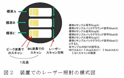本装置では、圧縮成型試料に各元素毎27回のレーザーのピンポイント照射を行い、発光強度を検出する。発光強度は各元素ごとにピーク波長と近接するバックグラウンド波長で測定を行い、各測定値の差を総プラズマ強度(照射レーザーの全エネルギー値)で補正することにより、相対発光強度を算出する(図2)。この時の測定時間は、約5分/点である。 |