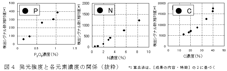 各元素ごとに選定した波長、レーザー出力(未掲載)において、堆肥に化学肥料を添加し、元素濃度を調整し、測定するとK、Ca等(図未掲載)では、高濃度域で飽和傾向にあるが、各元素とも良好な直線性が得られる(図4)。 |