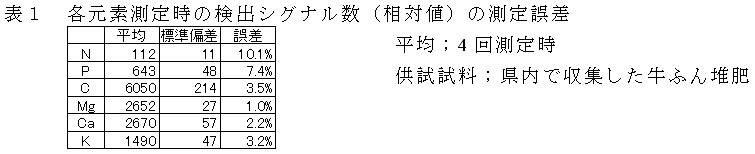 各元素測定時の測定誤差は、各元素とも10%程度以下である(表1)。 |
