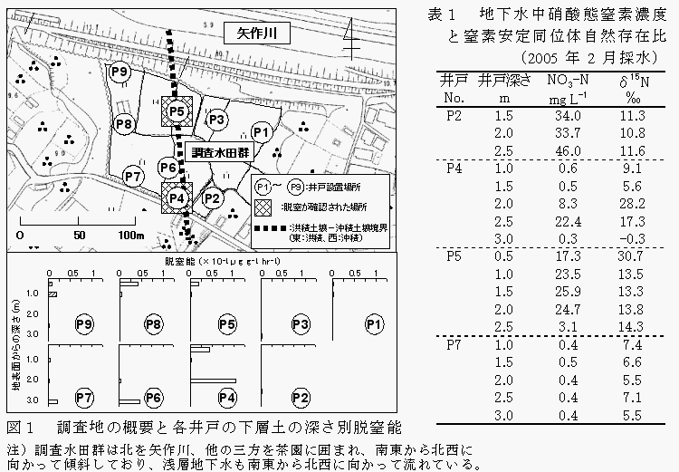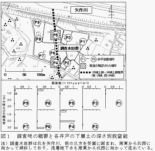 洪積台地上で地下水に負荷された硝酸態窒素の脱窒は、洪積土壌と沖積土壌の境界付近の脱窒能を有する土層で局所的に起きている。 |