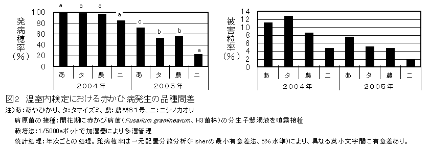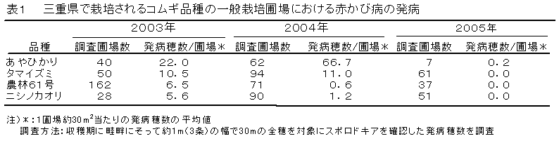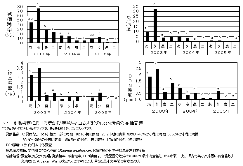 三重県で栽培されるコムギ品種「あやひかり」、「タマイズミ」は「農林61号」、「ニシノカオリ」に比べ、赤かび病抵抗性が弱い。 |
