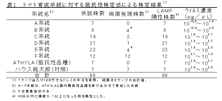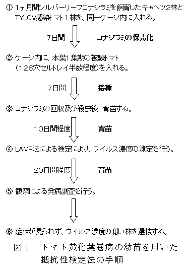 トマト黄化葉巻病の抵抗性検定法は、キャベツで増殖したシルバーリーフコナジラミをTYLCV感染トマトと同一ケージ内に7日間入れ保毒化後に、セル苗を7日間入れて接種し、接種後にLAMP法の検定と病徴観察を行い、抵抗性株を選抜する方法である。 |