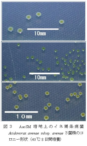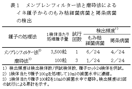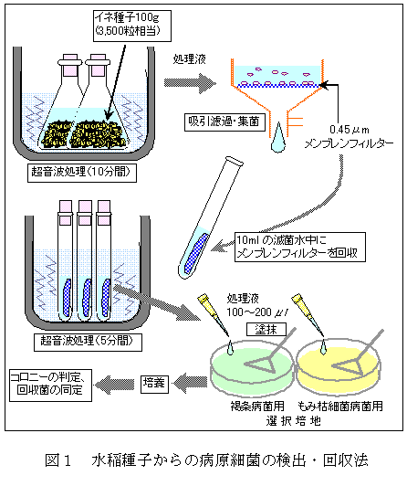 イネ種子100gを250ml水中で超音波処理し、メンブレンフィルター法で集菌し、再度フィルターを10ml水中に浸漬して超音波処理を行う。この処理液をもみ枯細菌病菌及び褐条病菌の選択培地で培養することで、比較的大量の種子から両病原細菌の検出及び分離が可能となる。 |