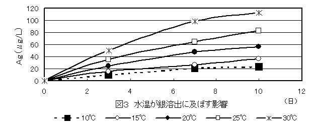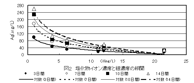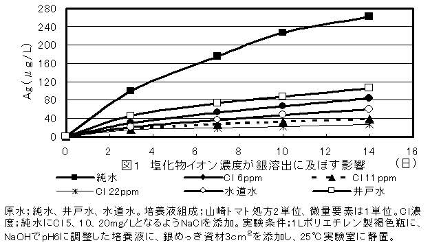銀めっき資材からの銀イオン(以下Ag)の溶出は、培養液中の塩化物イオン(以下Cl)濃度と水温に影響され、原水水質及び水温から殺菌に有効な銀濃度を確保するのに必要な浸せき期間が推定できる。一方、原水水質のCl濃度が20mg/L以上の場合は、本資材の導入は困難である。 |