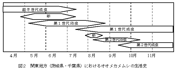 広食性土着天敵であるオオメカメムシの幼虫齢期は頭幅長を指標にして推定することができる。野外採集個体の発育段階別構成比の推移調査結果から、本種は成虫越冬で、千葉県ならびに茨城県では主に年1化し、一部の個体が年2化する生活史を有する。 |