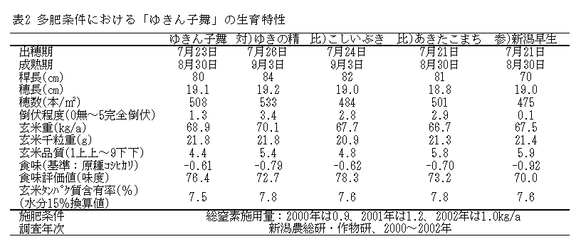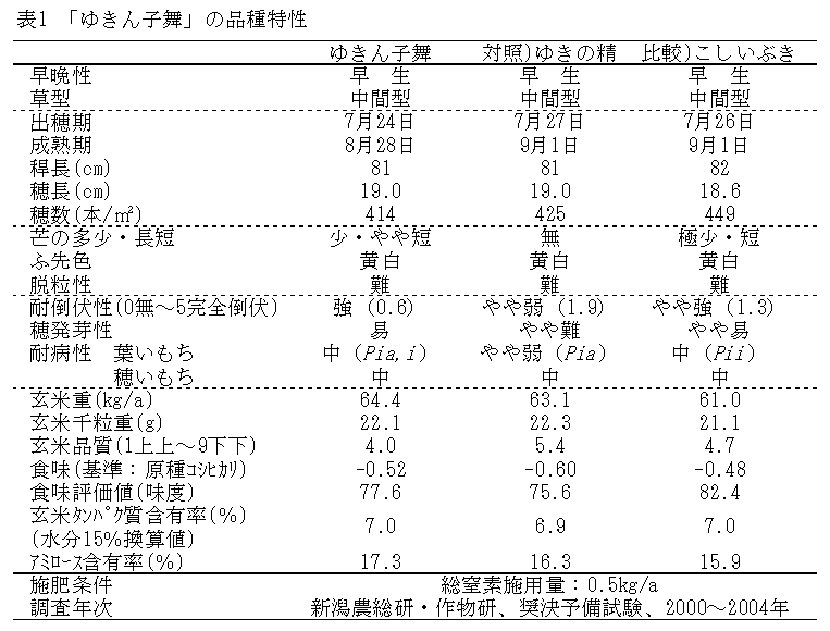 「ゆきん子舞」は、新潟県では早生の中間型に属する粳種である。耐倒伏性が強く、品質も高いことから、地力窒素の発現が大きい転作跡の圃場において安定した栽培が可能である。 |