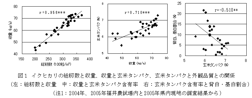 水稲「イクヒカリ」は、出穂期、成熟期ともにコシヒカリ並の中生で、短稈の偏穂重型品種で倒伏しにくく、収量性は高い。また、炊飯特性では冷めても軟らかいという特徴がある。ここでは、イクヒカリの収量性と外観品質、良食味性を発揮させるための葉色の指標値を明らかにする。 | ||||||||