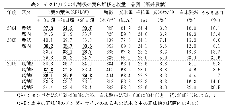 水稲品種「イクヒカリ」における食味成分・品質確保のための出穂後の葉色の指標値 |